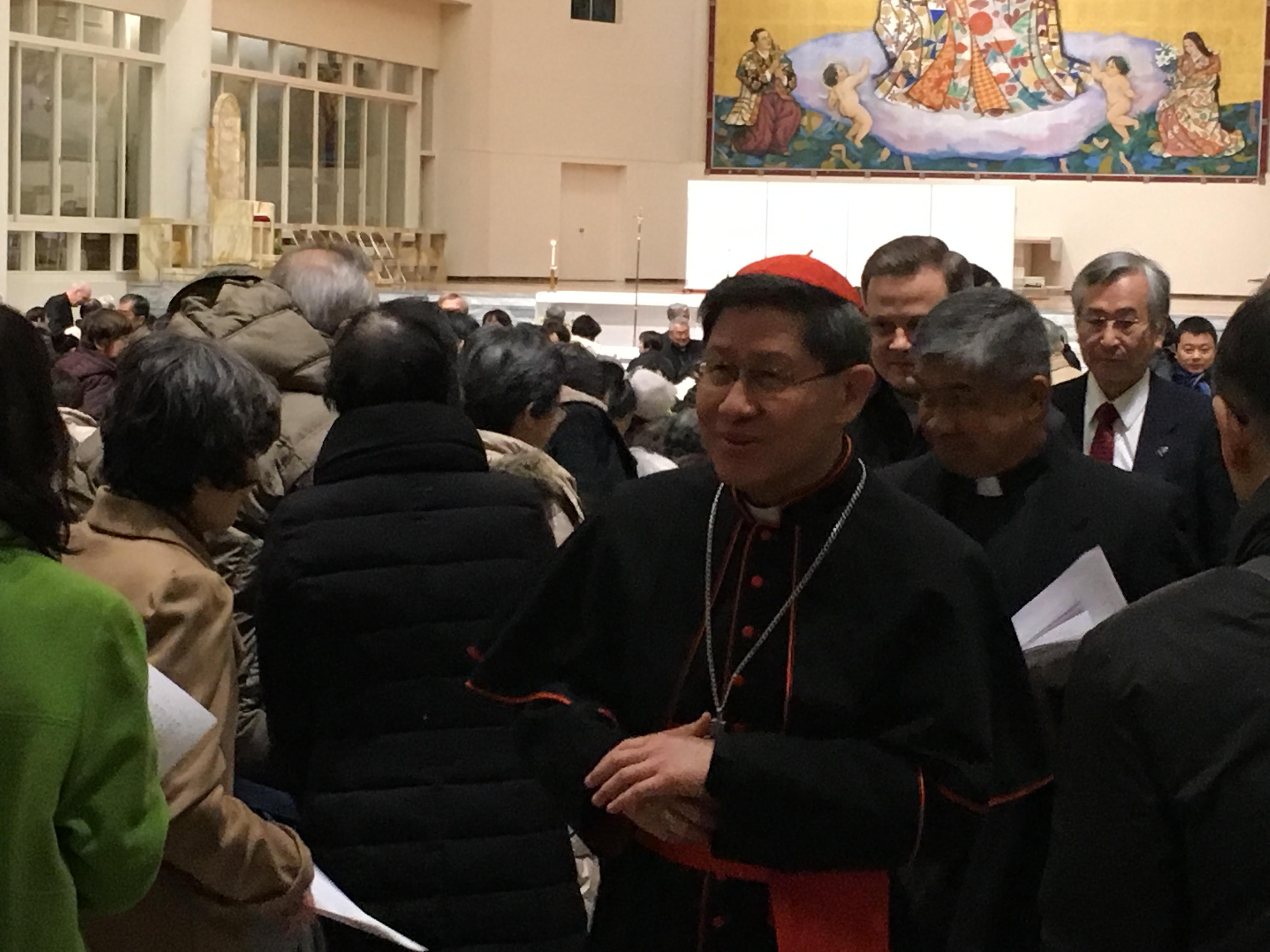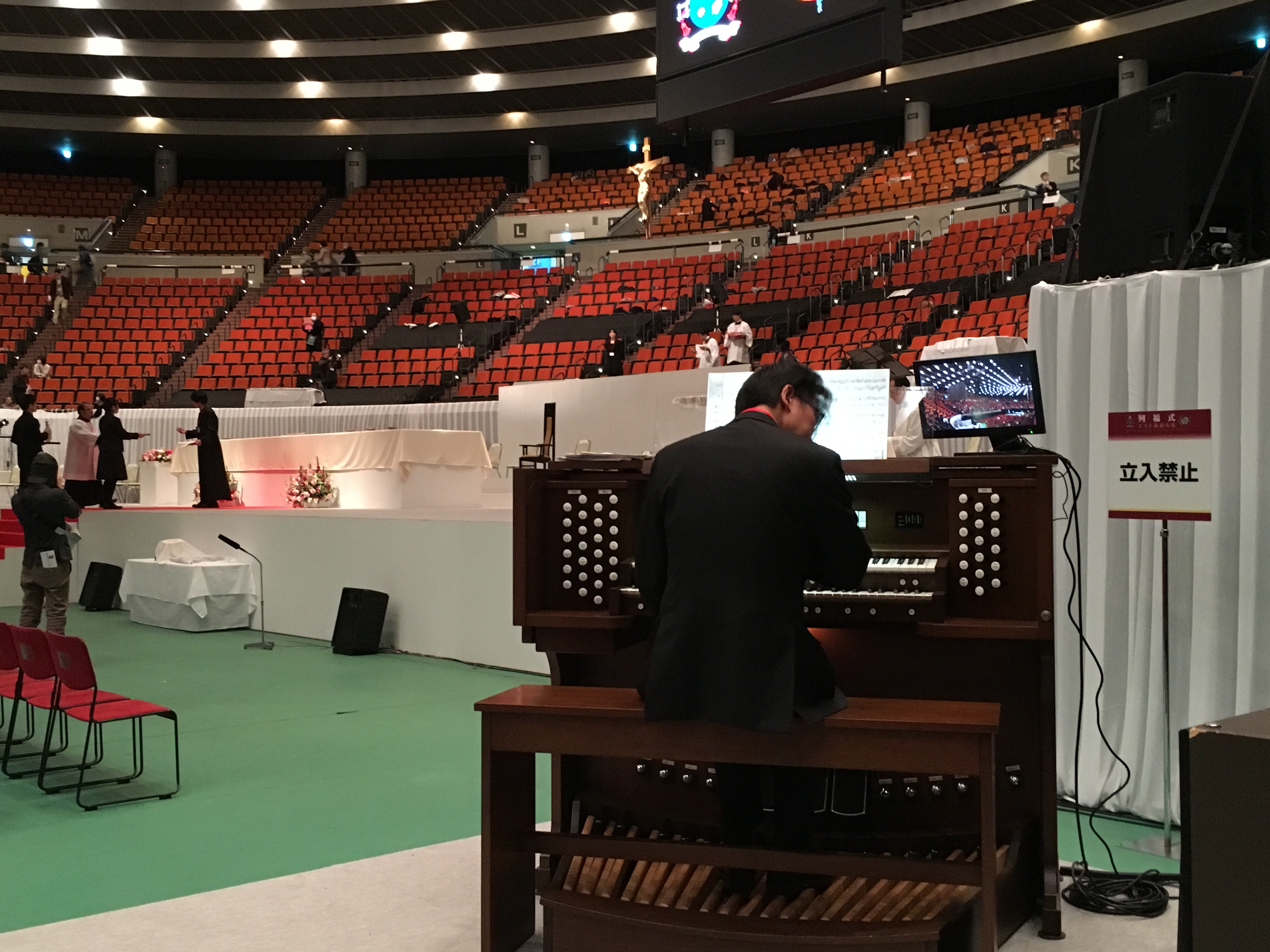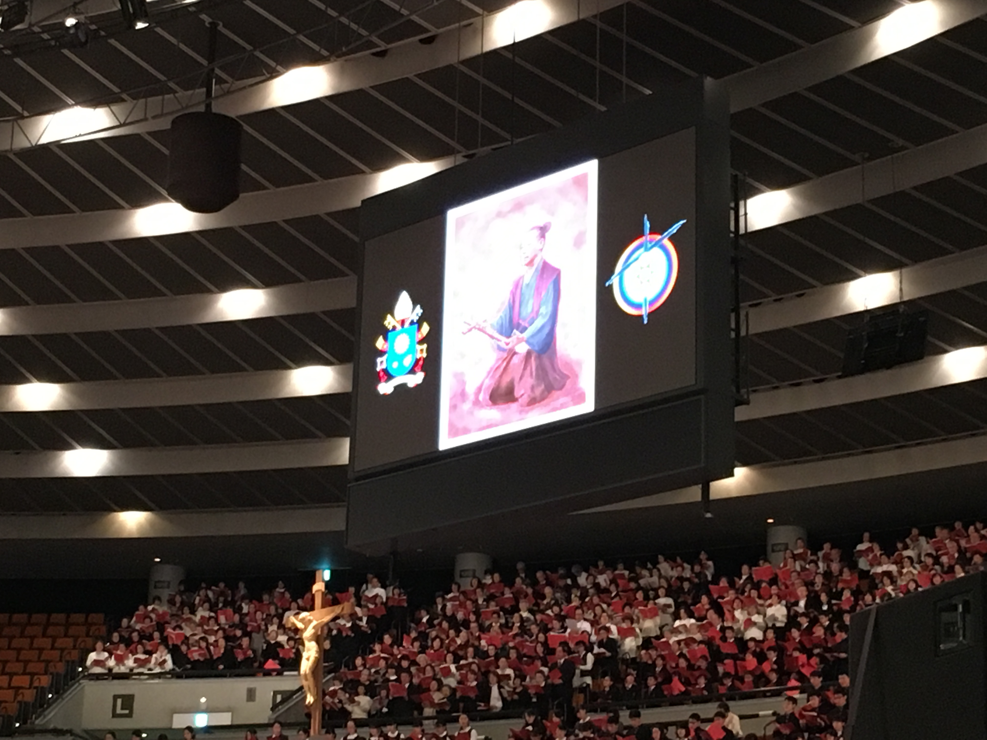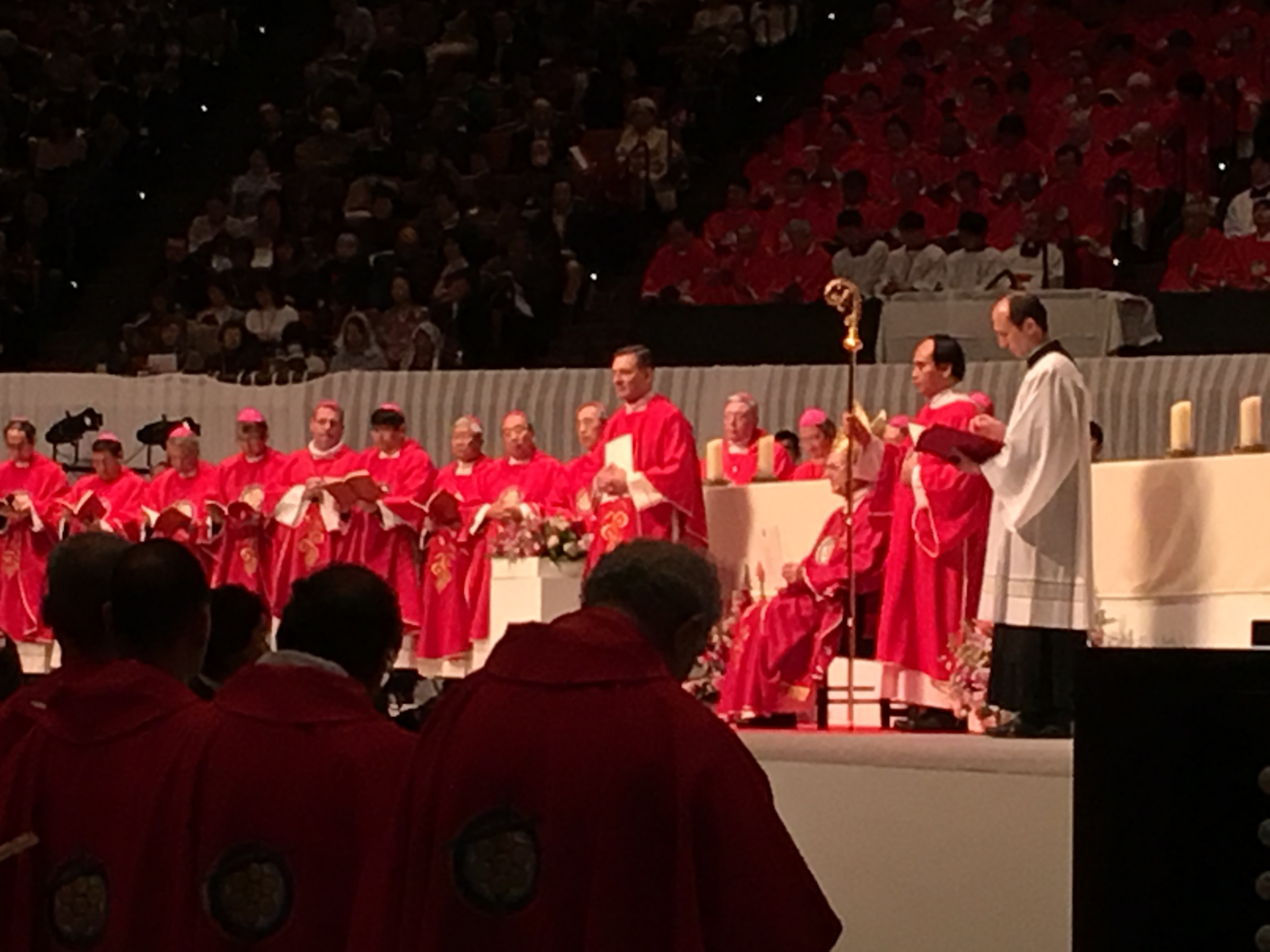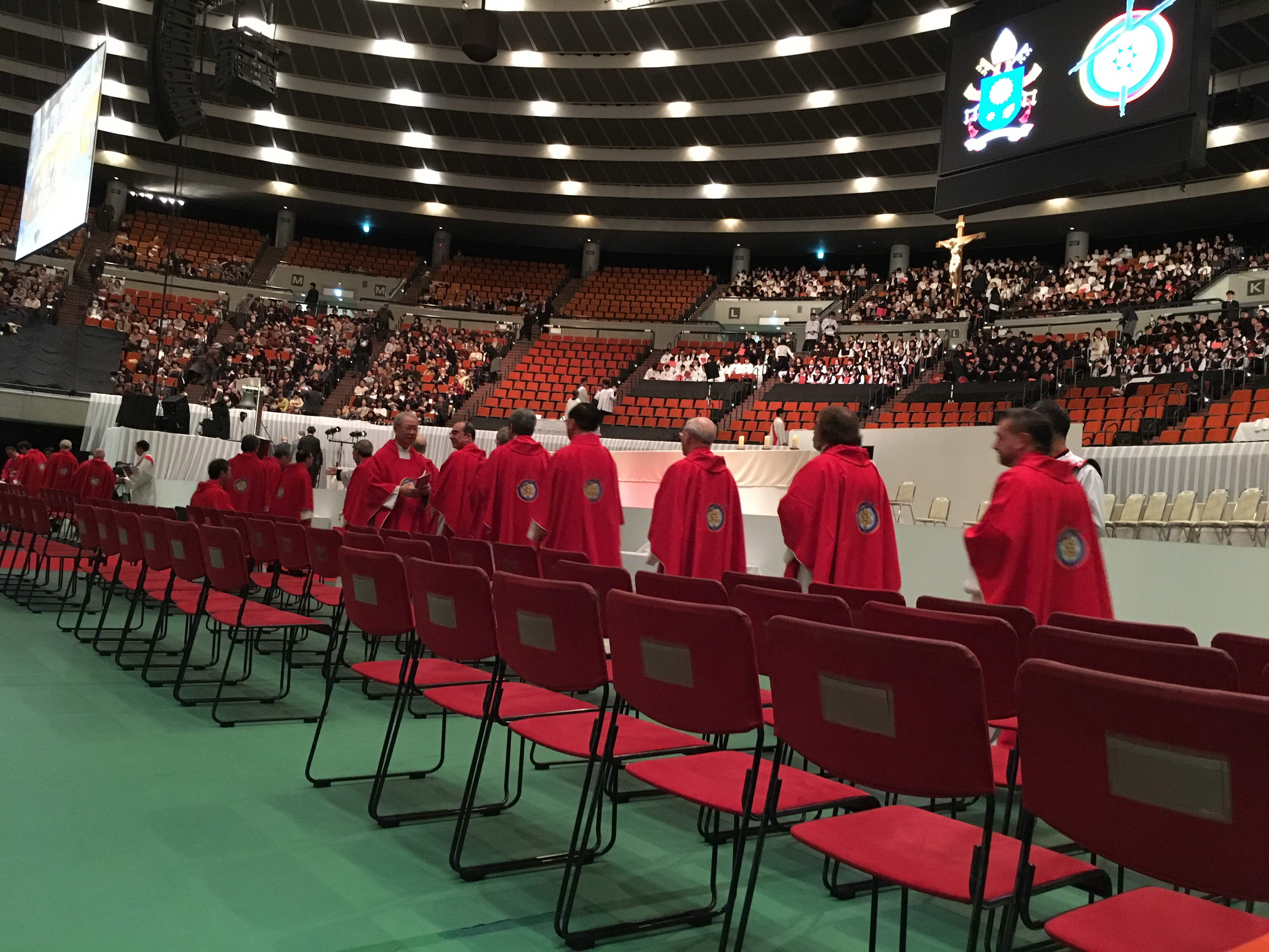 列福式のミサが続いています。聖体拝領をする司祭たちの赤い祭服がきれいです。
